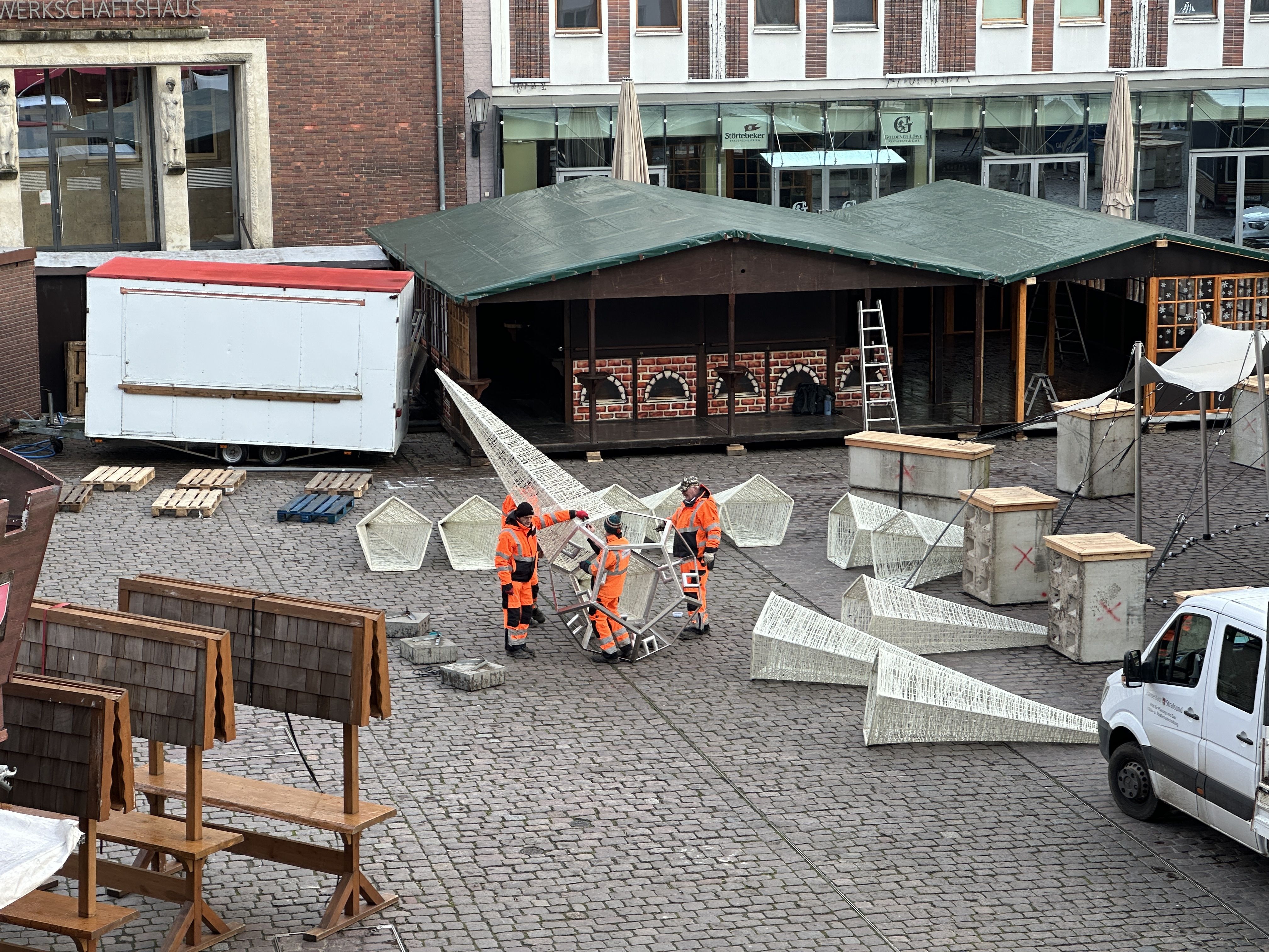 Hinzu kommen vier kleinere Sterne: im Hof der katholischen Kirche Frankenwall, auf dem Gelände des Hospiz "Gezeiten" und in den Türmen der beiden Kirchen St. Nikolai und St. Marien. Diese installierte heute Abend (ebenfalls 19. November) das THW in den Kirchtürmen. Vielen Dank dafür!